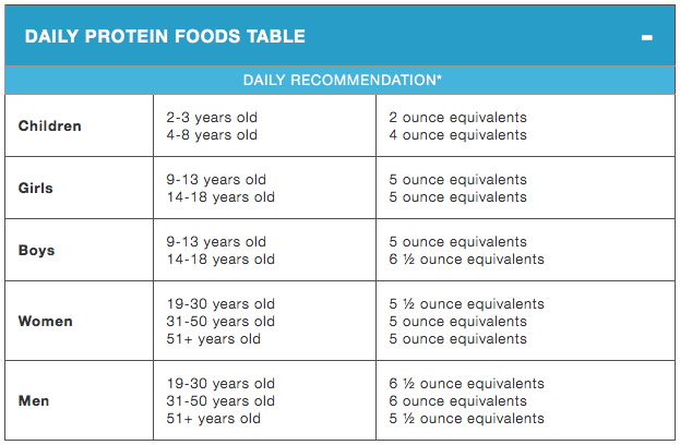 The Protein Foods Group includes foods made from meat, poultry, seafood, beans and peas, eggs, processed soy products, nuts, and seeds. The amount of protein foods you need to eat depends on age, gender, and level of physical activity. In general, 1 ounce of meat, poultry, or fish, 1/4 cup cooked beans, 1 egg, 1 tablespoon of peanut butter, or 1/2 ounce of nuts can be considered to be a 1 ounce-equivalent from the Protein Foods Group. The table below shows the recommended daily amounts.1